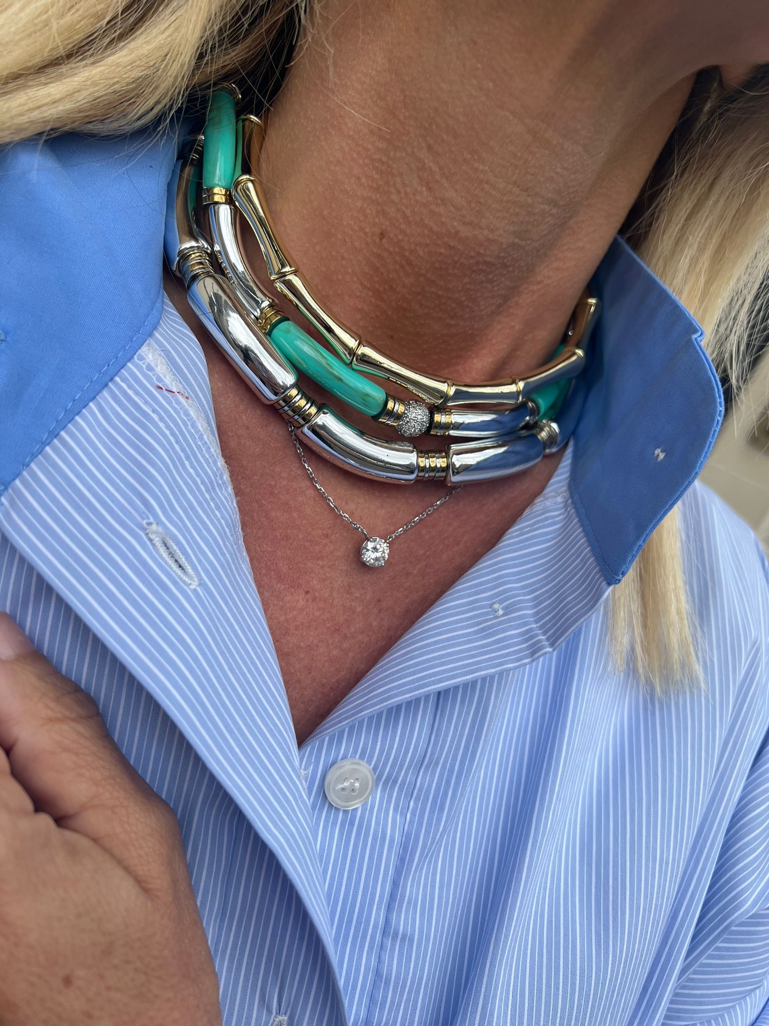 Ce collier est composé de tubes acryliques associés à une perle recouverte de zircons, qui apporte une touche d’éclat délicate et raffinée.