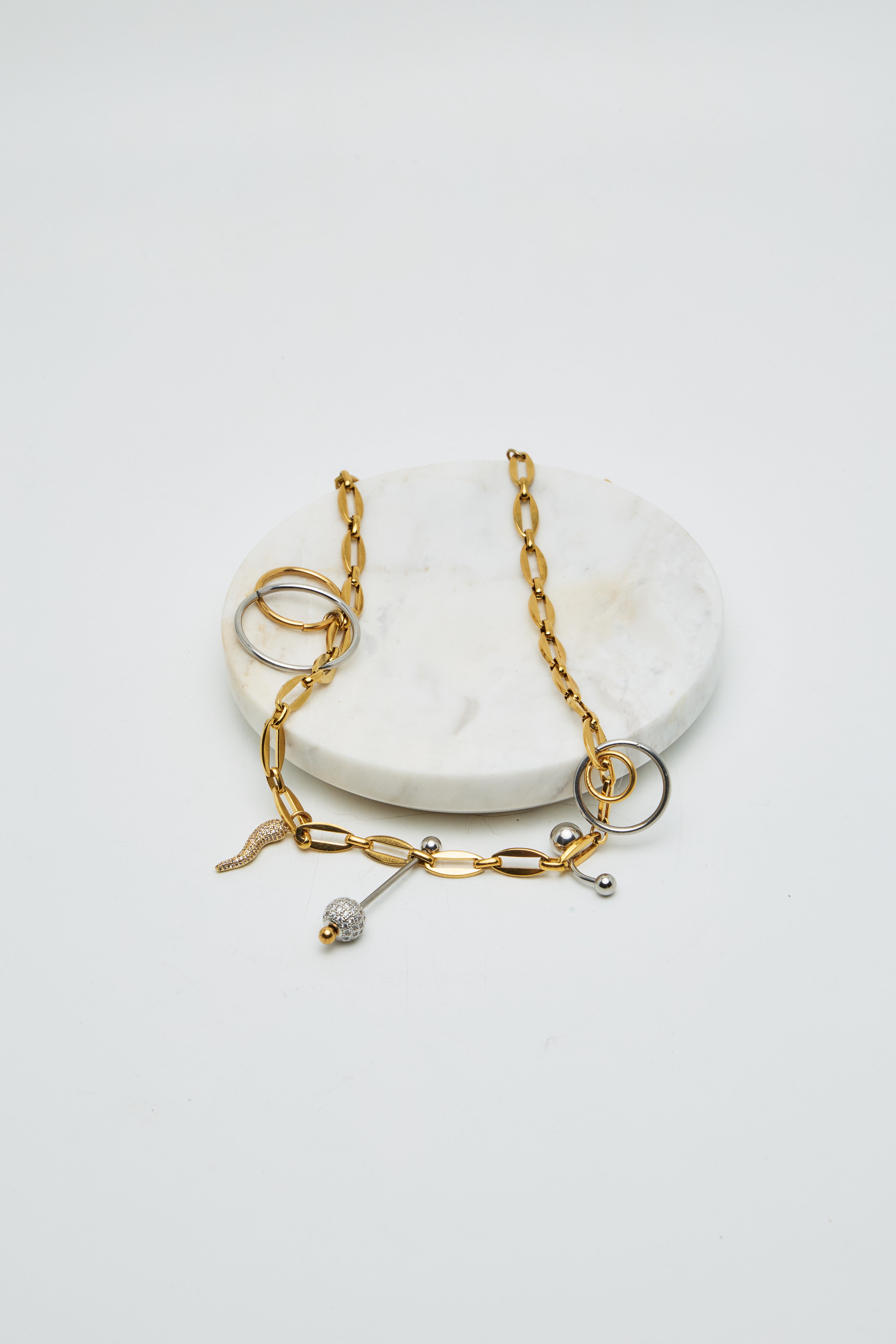 Le collier Charm se distingue par ses breloques et ses piercings, offrant une allure résolument rock et moderne. Une pièce forte qui apporte immédiatement du caractère à votre look.