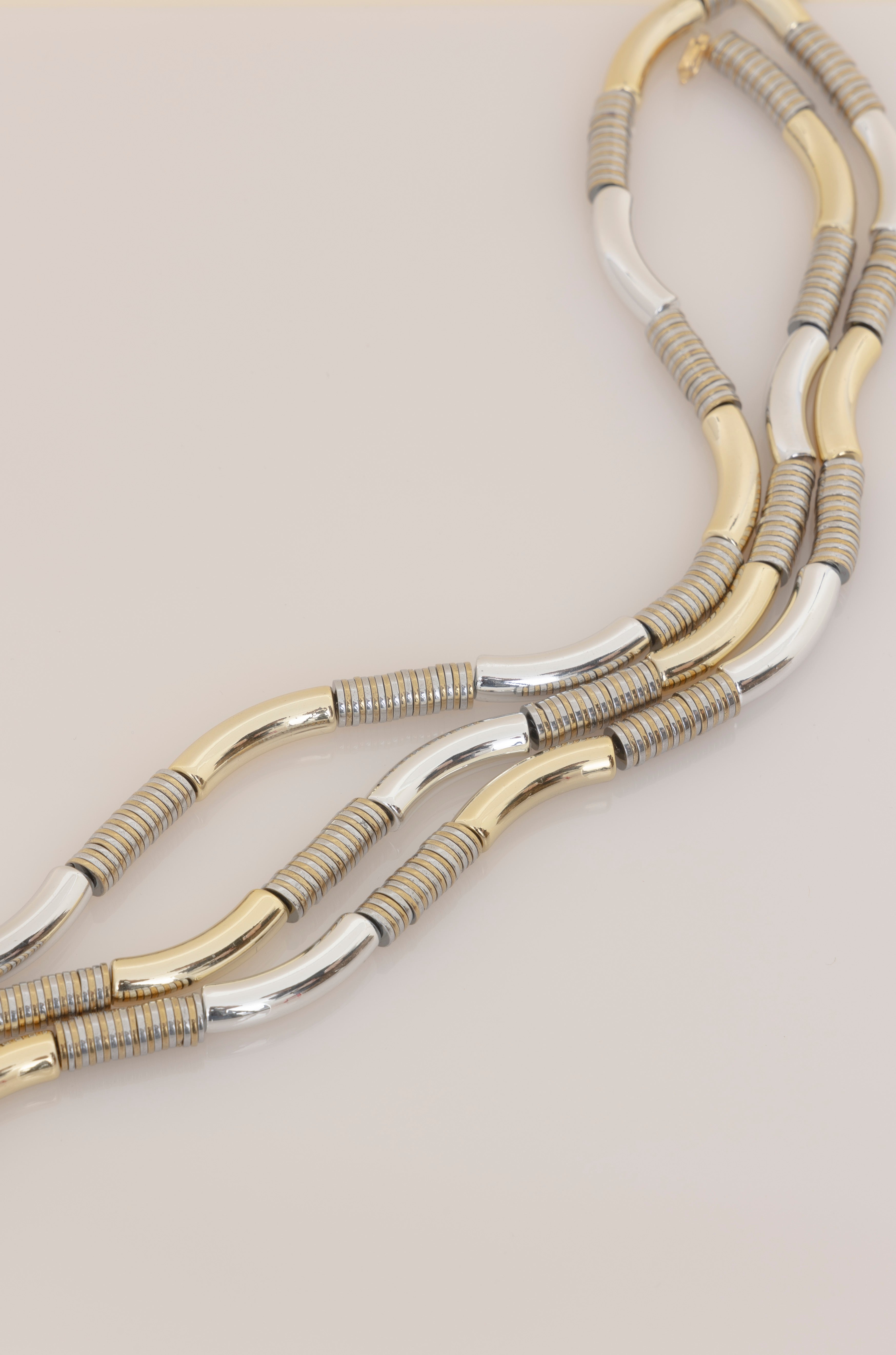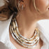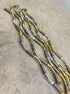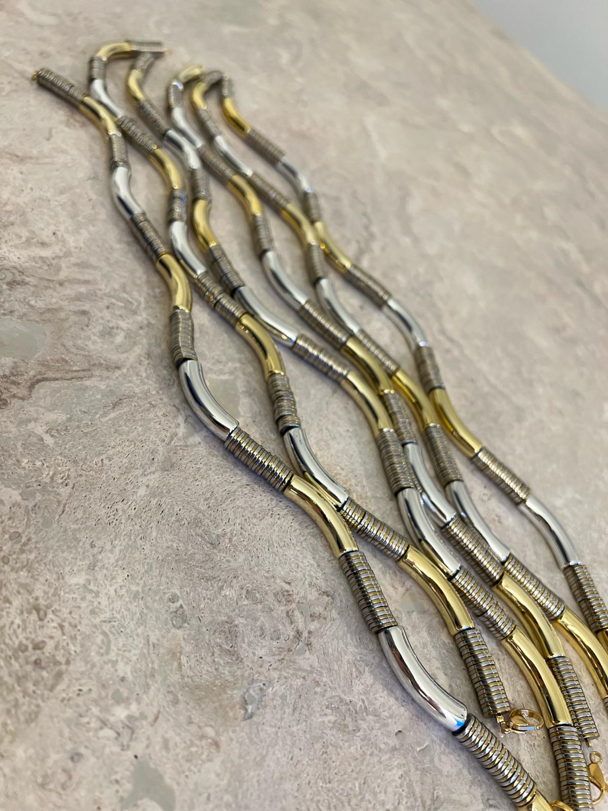 Ce collier est composé de tubes fins en acrylique doré et argenté, associés à des perles plates d’hématite dans les mêmes tonalités, placées en alternance pour créer un jeu de contrastes subtil et raffiné. Un modèle versatile et intemporel, idéal seul ou en accumulation.